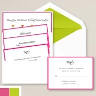 100% Satisfaction Guaranteed On All Orders! You've finally found your true love! This all-inclusive bright white invitation features embossed and printed hearts trimmed with a hot pink or kiwi border. Invitation comes with folder, invitation, reply card and two additional cards to contain all of your wedding day events.